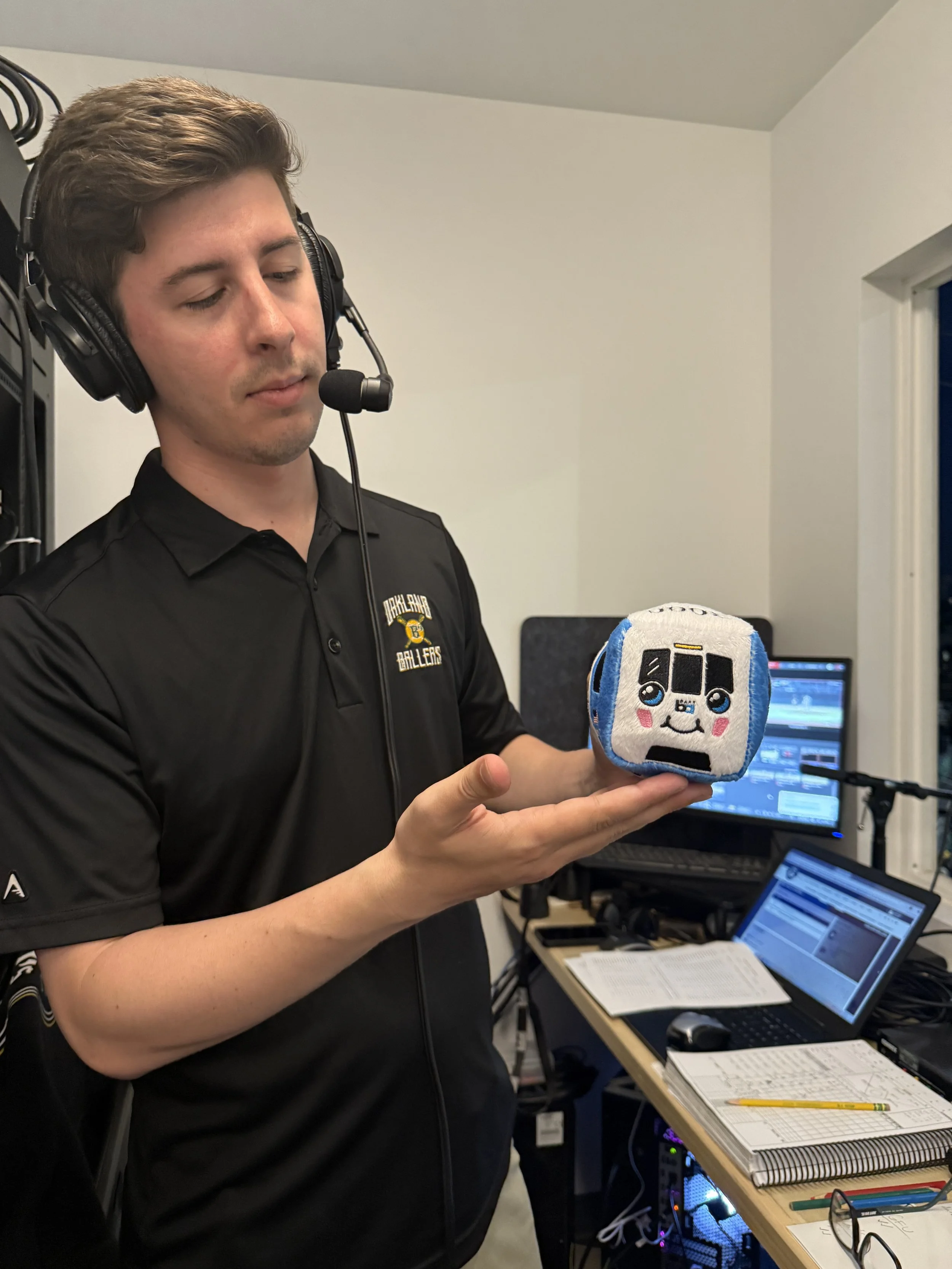 Petersen holds a plush Bart car during a 2025 Ballers broadcast.